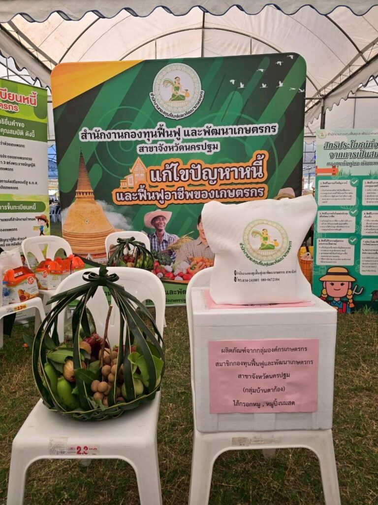 ทั้งนี้ สำนักงานกองทุนฟื้นฟูและพัฒนาเกษตรกร โดยนางวรรณี มหานีรานนท์ เลขาธิการสำนักงานกองทุนฟื้นฟูและพัฒนาเกษตรกร นางสาวรัชดา พงศ์ภูมิมาศ หัวหน้าสำนักงานสาขาจังหวัดนครปฐม คณะอนุกรรมการฯ จังหวัด และพนักงานลูกจ้างตลอดจนเกษตรกรสมาชิกกองทุนฟื้นฟูและพัฒนาเกษตรกรจังหวัดนครปฐม ได้เข้าร่วมต้อนรับในครั้งนี้ และมีหัวหน้าส่วนราชการสังกัดกระทรวงเกษตรและสหกรณ์ หัวหน้าส่วนราชการระดับจังหวัดและระดับอำเภอที่เกี่ยวข้อง เข้าร่วมกิจกรรมดังกล่าว ซึ่ง รองนายกรัฐมนตรี (ร.อ.ธรรมนัส) และคณะ ได้เยี่ยมชมบูธ ของสำนักงานกองทุนฟื้นฟูฯ สาขาจังหวัดนครปฐม ซึ่งมาออกบูธประชาสัมพันธ์ ภารกิจงานด้านต่าง ๆ ของสำนักงาน ได้แก่ การขึ้นทะเบียนหนี้ การจขึ้นทะเบียนองค์กรเกษตรกร และมีผลิตภัณฑ์การเกษตรของกลุ่มองค์กรเกษตรกร สมาชิก กฟก.จังหวัดนครปฐม เช่น ผลไม้สด ไส้กรอกหมู หมูปิ้ง น้ำฟักข้าว มาจัดแสดงในงานดังกล่าว โดยบูธของสำนักงาน ได้รับความสนใจจากเกษตรกร ประชาชน ที่มาร่วมงานเป็นอย่างมาก