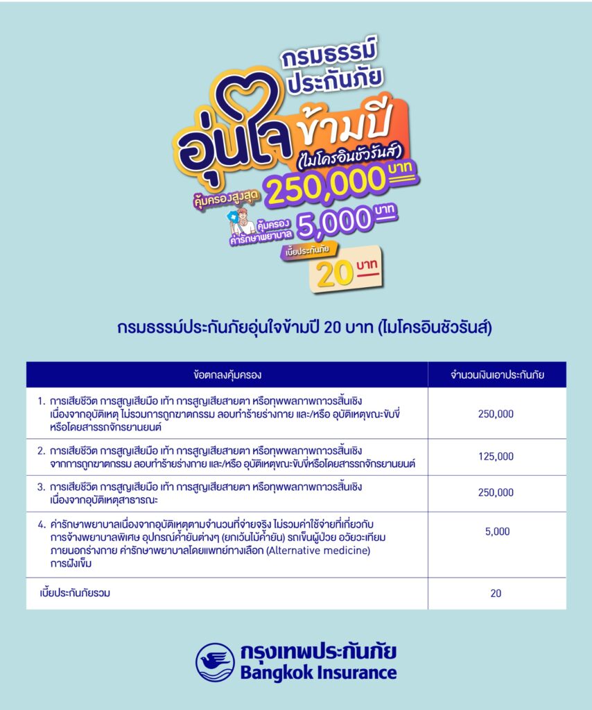 · กรมธรรม์ประกันภัยอุ่นใจข้ามปี 20 บาท (ไมโครอินชัวรันส์) รับประกันภัยตั้งแต่อายุ 15-70 ปี โดยให้ความคุ้มครอง