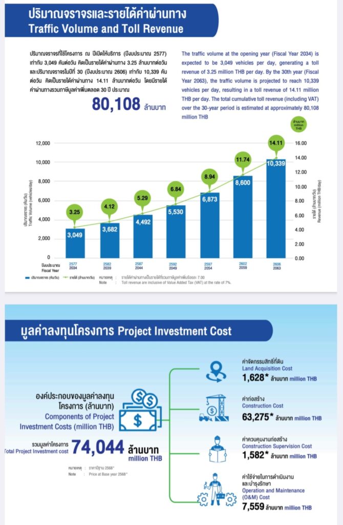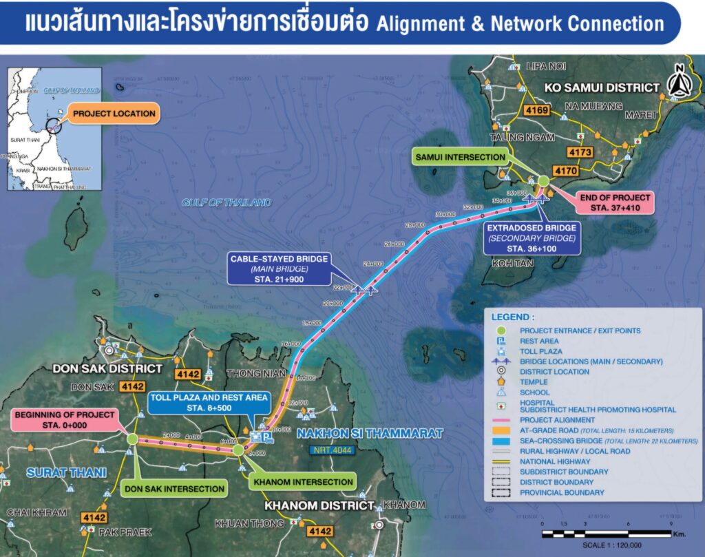 สำหรับมูลค่าการลงทุนโครงการ ประกอบด้วย ค่าจัดกรรมสิทธิ์ที่ดิน ค่าก่อสร้างโครงการ ค่าควบคุมงาน และค่าใช้จ่ายในการดำเนินงานและบำรุงรักษาโครงการ รวมเป็นมูลค่าการลงทุนประมาณ 74,044 ล้านบาท โดยโครงการมีผลตอบแทนด้านเศรษฐกิจ (EIRR) ร้อยละ 15.58 และผลตอบแทนด้านการเงิน (FIRR) ร้อยละ -0.31 ทั้งนี้คาดว่าจะเริ่มดำเนินการก่อสร้างในปี พ.ศ. 2571 และมีกำหนดเปิดให้บริการในปี พ.ศ. 2576 ทั้งนี้ การทางพิเศษแห่งประเทศไทยยังได้มุ่งเน้นการพัฒนาเพื่อเพิ่มความสะดวกและรวดเร็วในการเดินทางระหว่างเกาะสมุยกับแผ่นดินใหญ่ เสริมสร้างความมั่นคงของระบบโครงสร้างพื้นฐานและสาธารณูปโภคบนเกาะสมุย” นายสุรเชษฐ์ กล่าวในท้ายที่สุด