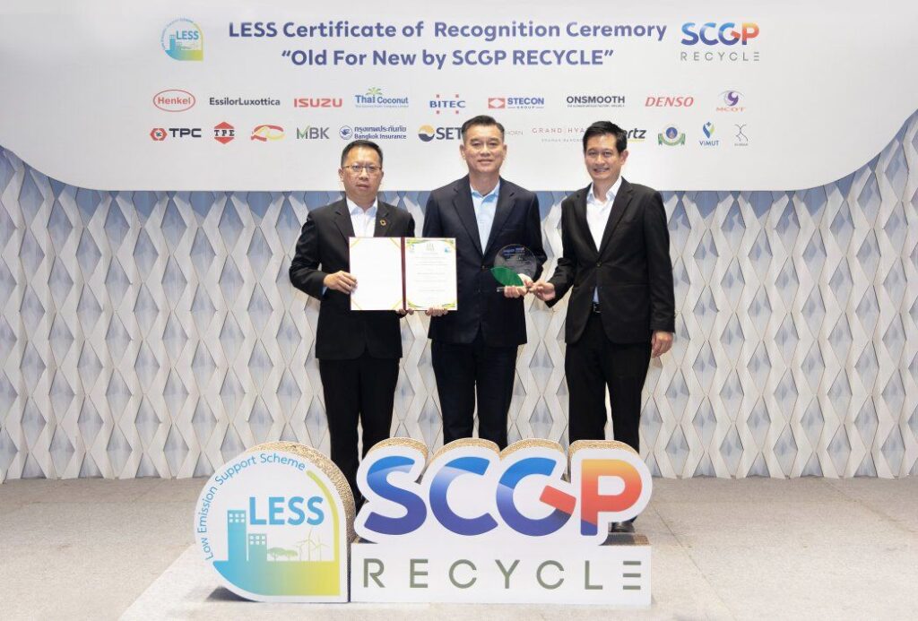 บริษัท กรุงเทพประกันภัย จำกัด (มหาชน) โดยนายพิสิฐ คิดเจริญสุข (กลาง) รองผู้อำนวยการอาวุโส ฝ่ายสินไหมทดแทนยานยนต์ เป็นผู้แทนบริษัทฯ รับมอบโล่พร้อมใบประกาศเกียรติคุณ โครงการสนับสนุนกิจกรรมลดก๊าซเรือนกระจก (Low Emission Support Scheme: LESS) ภายใต้โครงการ “Old For New โดย SCGP RECYCLE” ในพิธีมอบใบประกาศเกียรติคุณภายใต้โครงการสนับสนุนกิจกรรมลดก๊าซเรือนกระจก ซึ่งได้รับเกียรติจากนายณกรณ์ ตรรกวิรพัท (ซ้าย) ผู้อำนวยการองค์การบริหารจัดการก๊าซเรือนกระจก (องค์การมหาชน) และนายดนัยเดช เกตุสุวรรณ (ขวา) ประธานเจ้าหน้าที่บริหารสายการเงิน บริษัท เอสซีจี แพคเกจจิ้ง จำกัด (มหาชน) เป็นผู้มอบ ณ อาคารอเนกประสงค์ สำนักงานใหญ่ SCG บางซื่อ กรุงเทพฯ เมื่อวันที่ 25 กุมภาพันธ์ 2569
