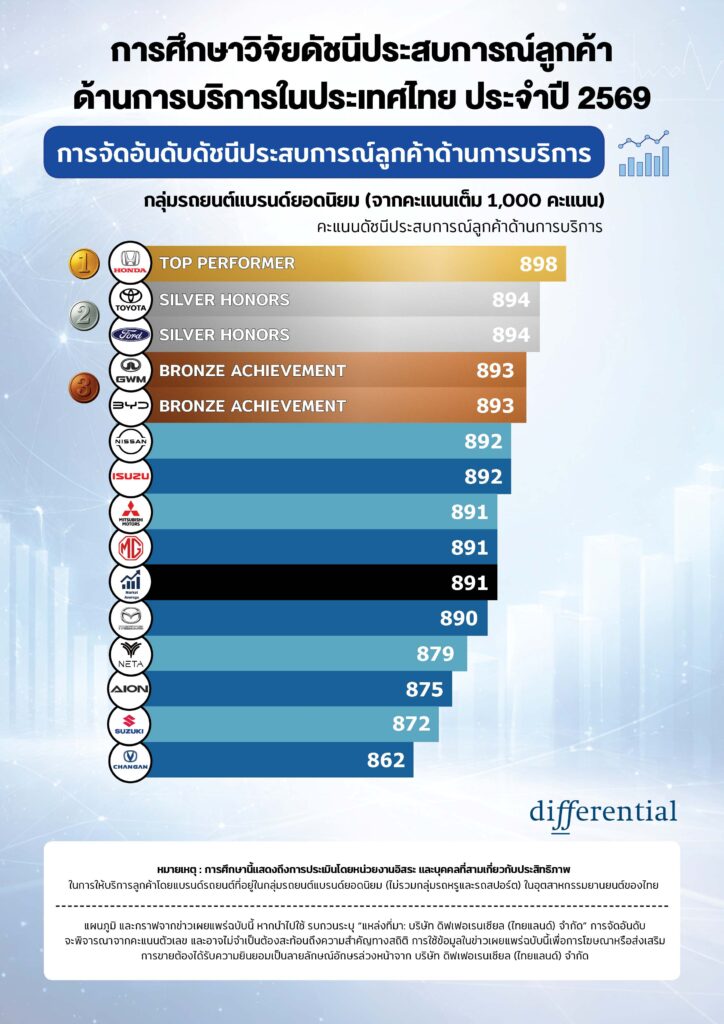 นายศิรส สาตราภัย กรรมการผู้จัดการ บริษัท ดิฟเฟอเรนเชียล ประจำประเทศไทย เปิดเผยเพิ่มเติมว่า “จากการศึกษาวิจัยประสบการณ์ลูกค้าด้านความพึงพอใจในการนำรถเข้ารับบริการหลังการขายจากศูนย์บริการรถยนต์มาตรฐานของแต่ละยี่ห้อทั่วประเทศในครั้งนี้ เราพบประเด็นที่น่าสนใจ เช่น คะแนน Service CXI โดยรวมในปี 2569 ลดลง 2 คะแนน สะท้อนถึงความท้าทายที่เพิ่มขึ้นของแบรนด์ต่าง ๆ ในการส่งมอบประสบการณ์ที่เหนือความคาดหวังของลูกค้า