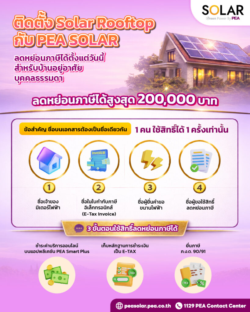 แอบกระซิบว่าลดหย่อนสูงสุดถึง 200,000 บาท และสามารถใช้สิทธิ์ลดหย่อนภาษีได้ตั้งแต่ปี 2569 จนถึงปี 2571 สนใจติดต่อ 1129 PEA Contact Center คลิกเลย : https://bit.ly/3Nkus9Q สำนักงานการไฟฟ้าส่วนภูมิภาค ทุกแห่งทั่วประเทศ