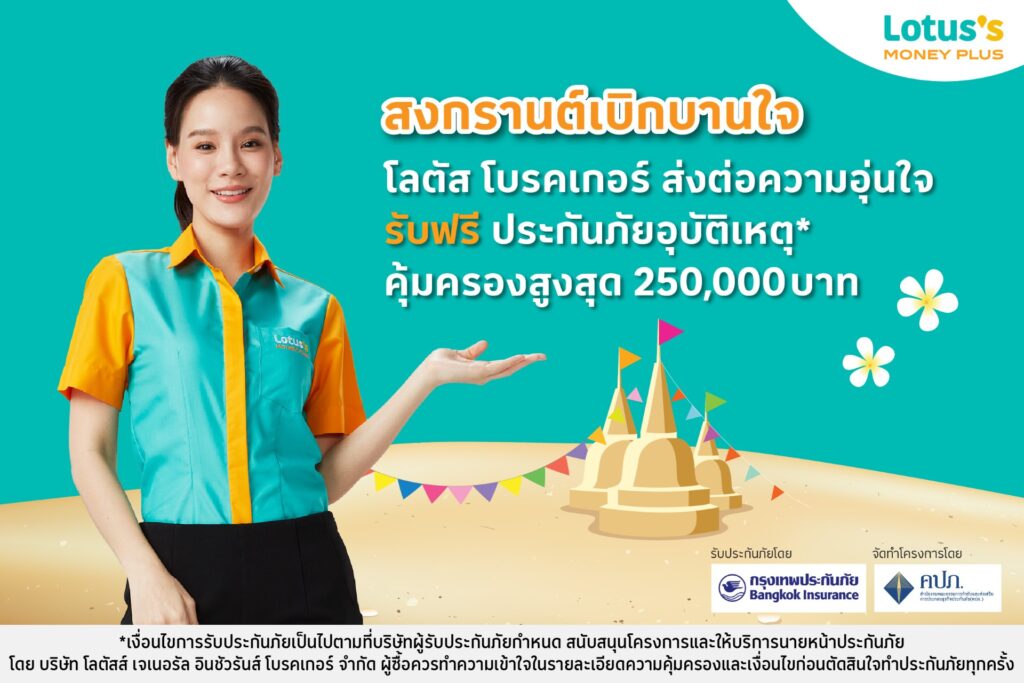 โลตัส โบรคเกอร์ สานพันธกิจ “พลัสความสุข ทุกความคุ้มค่า” ส่งต่อความอุ่นใจช่วงสงกรานต์ มอบกรมธรรม์ประกันอุบัติเหตุฟรี จำนวน 10,000 กรมธรรม์ให้กับประชาชนทั่วไป ตั้งแต่ 1 เมษายน 2569 – 31 พฤษภาคม 2569 (หรือจนกว่าสิทธิ์จะเต็ม) ด้วยความคุ้มครองอุบัติเหตุสูงสุด 250,000 บาท พร้อมค่ารักษาพยาบาลสูงสุด 5,000 บาท นาน 30 วัน โดยลงทะเบียนรับสิทธิ์ได้ที่เคาน์เตอร์โลตัส มันนี่ พลัส กว่า 200 สาขาทั่วประเทศ เพื่อส่งเสริมให้ประชาชนมีหลักประกันความคุ้มครองอุบัติเหตุและการเข้าถึงประกันภัย รวมถึงสนับสนุนนโยบายการสร้างการรับรู้ด้านประกันภัยของสำนักงานคณะกรรมการกำกับและส่งเสริมการประกอบธุรกิจประกันภัย (คปภ.) กรมธรรม์ดังกล่าวให้บริการนายหน้าประกันภัยโดย บริษัท โลตัสส์ เจเนอรัล อินชัวรันส์ โบรคเกอร์ จำกัด และรับประกันภัยโดย บริษัท กรุงเทพประกันภัย จำกัด (มหาชน) ทั้งนี้ รายละเอียดความคุ้มครองและเงื่อนไขเป็นไปตามที่ระบุไว้ในกรมธรรม์