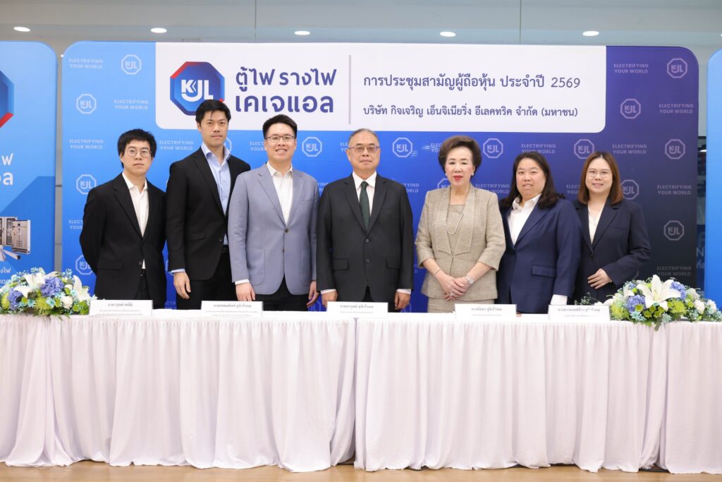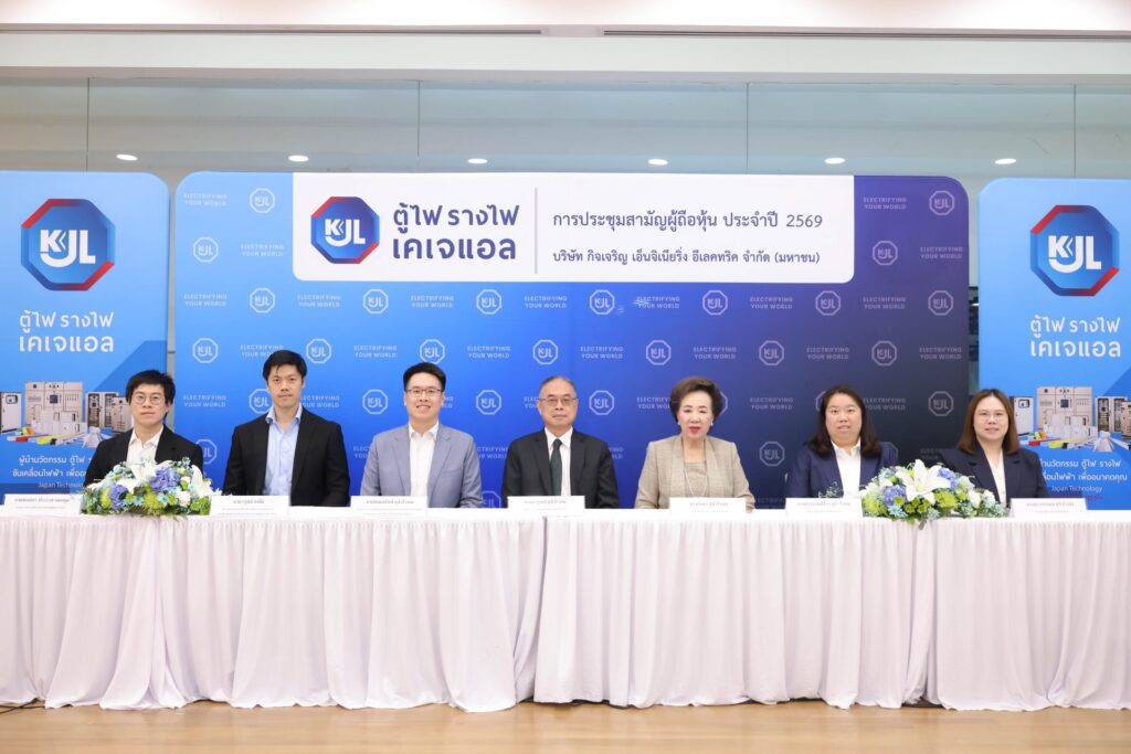 นายการุณย์ สุจิวโรดม (ที่ 4 จากขวา) ประธานกรรมการ นายเกษมสันต์ สุจิวโรดม (ที่ 3 จากซ้าย) ประธานเจ้าหน้าที่บริหาร บริษัท กิจเจริญ เอ็นจิเนียริ่ง อีเลคทริค จำกัด (มหาชน) หรือ KJL พร้อมด้วยคณะกรรมการบริษัทฯ เข้าร่วมการประชุมสามัญผู้ถือหุ้น ประจำปี 2569 ในรูปแบบ Hybrid (Physical และ e-AGM) การประชุมผ่านสื่ออิเล็กทรอนิกส์ บริษัทฯ ชี้แจงผลการดำเนินงานปีที่ผ่านมา พร้อมทิศทางการเติบโต มุ่งขยายกำลังการผลิต ช่องทางการจัดจำหน่าย และการดำเนินธุรกิจให้ครอบคลุมทั่วประเทศ ควบคู่การยกระดับองค์กรสู่มาตรฐานสากล เพื่อขับเคลื่อนการเติบโตอย่างแข็งแกร่งและยั่งยืน ผ่านการพัฒนานวัตกรรม การขยายเครือข่ายธุรกิจ และการสร้าง Ecosystem รวมถึงการพัฒนาผลิตภัณฑ์และโซลูชันใหม่ รองรับเมกะเทรนด์สำคัญ อาทิ พลังงานสะอาด Data Center และโครงสร้างพื้นฐานดิจิทัล โดยเสริมประสิทธิภาพ Supply Chain ผ่านโครงการ “KJL NOW” และการลงทุนใน “KJL Innovation Campus