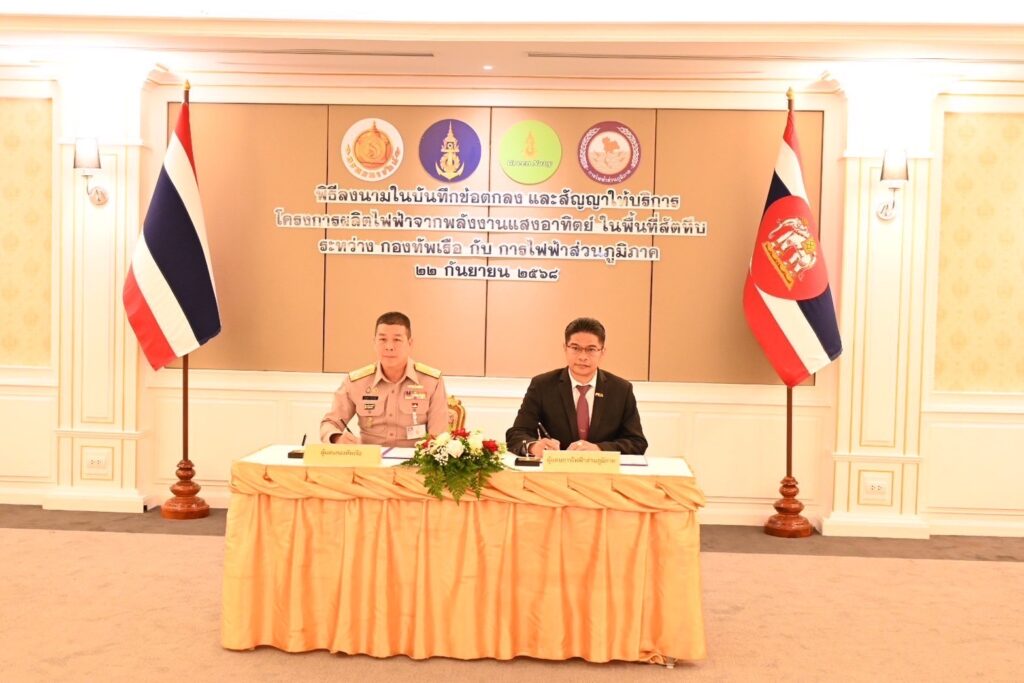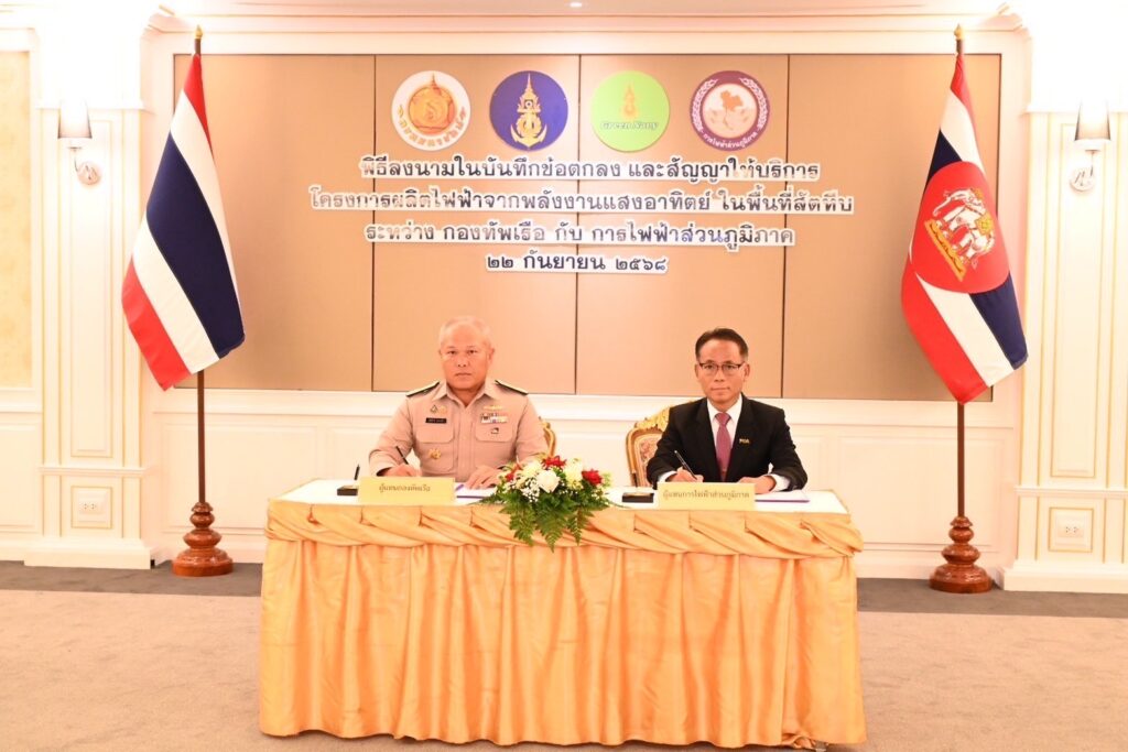 ผู้บัญชาการทหารเรือ ร่วมเป็นเกียรติในพิธีลงนามในบันทึกข้อตกลงความร่วมมือและสัญญาให้บริการ โครงการจัดการพลังงานไฟฟ้าจากระบบผลิตไฟฟ้าพลังงานแสงอาทิตย์ที่ติดตั้งแบบลอยน้ำ (Floating Solar) และแบบติดตั้งบนพื้นดิน (Solar Farm) ภายในหน่วยงานของกองทัพเรือ พื้นที่สัตหีบ จำนวน 6 พื้นที่ ณ ห้องรับรอง ชั้น 2 อาคารกองบัญชาการกองทัพเรือ