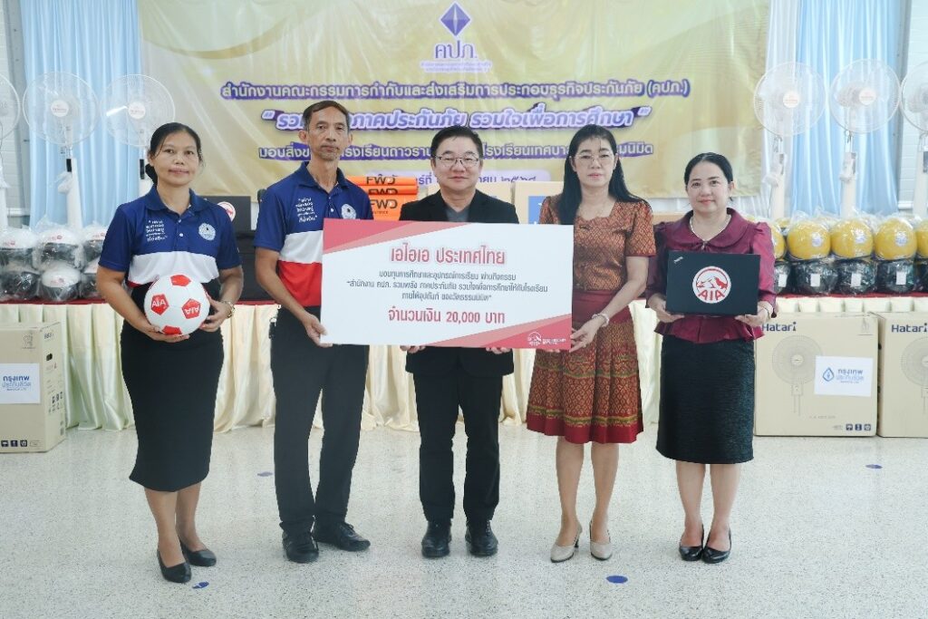 นอกจากนี้ นายสุวิรัช พงศ์เสาวภาคย์ (กลาง) ผู้อำนวยการฝ่ายกิจการภายนอก เป็นผู้แทนเอไอเอ ประเทศไทยมอบทุนการศึกษาจำนวน 20,000 บาท ลูกฟุตบอล 5 ลูก และแล็ปท็อป 10 เครื่อง โดยมีนายโชคอนันต์ นาคสงวน ผู้อำนวยการโรงเรียนเทศบาลวัดธรรมนิมิต และนางสาวณัฏฐ์วิภา สุริยันต์ (ที่ 2 จากขวา) รองผู้อำนวยการกลุ่มบริหารงานบุคคล โรงเรียนถาวรานุกูล เป็นผู้รับมอบ ผ่านกิจกรรม “สำนักงาน คปภ. รวมพลังภาคประกันภัย รวมใจเพื่อการศึกษาให้กับโรงเรียนภายใต้การอุปถัมภ์ของวัดธรรมนิมิต” เพื่อส่งเสริมด้านการศึกษาแก่เด็กนักเรียนของโรงเรียนในพระอุปถัมภ์ของวัดธรรมนิมิตทั้ง 2 แห่ง ซึ่งกิจกรรมครั้งนี้สะท้อนถึงความมุ่งมั่นของเอไอเอ ประเทศไทย ในการมีส่วนร่วมกับสังคมและชุมชน ผ่านการสนับสนุนกิจกรรมทางศาสนาและวัฒนธรรม ตลอดจนส่งเสริมด้านการศึกษาของเยาวชนไทย สอดคล้องกับพันธกิจที่มุ่งมั่นในการสนับสนุนให้คนไทยและเยาวชนมีสุขภาพและชีวิตที่ดีขึ้น ตามคำมั่นสัญญา ‘Healthier, Longer, Better Lives’