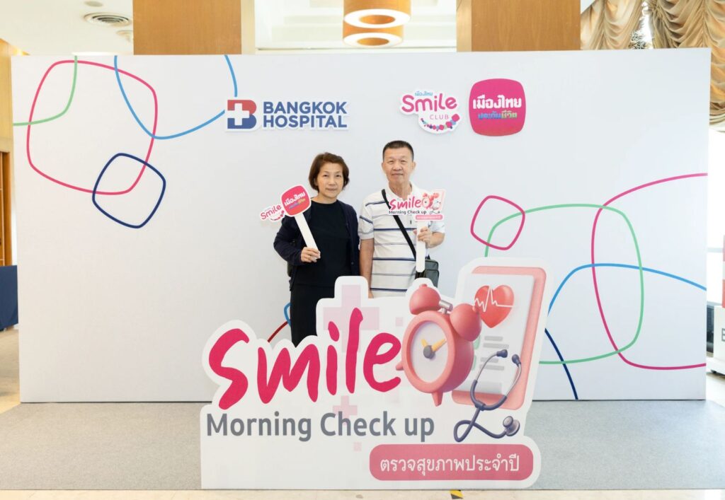 บริษัท เมืองไทยประกันชีวิต จำกัด (มหาชน) โดย เมืองไทยสไมล์คลับ ร่วมกับโรงพยาบาลกรุงเทพ ห่วงใยและใส่ใจด้านสุขภาพ จัดกิจกรรมตรวจสุขภาพประจำปี “Smile Morning Check up” ให้กับสมาชิกเมืองไทยสไมล์คลับ เพื่อให้ทุกคนได้รู้ถึงสุขภาพของตนเองและเตรียมพร้อมในการดูแลตัวเองได้อย่างถูกต้อง งานจัดขึ้น ณ โรงพยาบาลกรุงเทพ สำนักงานใหญ่ (ซ.ศูนย์วิจัย) โดยในงานมีนางสาวพรทิวา พฤกสถิตย์ ผู้ช่วยกรรมการผู้จัดการ บริษัท เมืองไทยประกันชีวิต จำกัด (มหาชน) พร้อมนายแพทย์ชยพล ชีถนอม อายุรแพทย์ Cardio-metabolic และนายแพทย์ชาติทนง ยอดวุฒิ อายุรศาสตร์เฉพาะทางโรคหัวใจ โรงพยาบาลกรุงเทพ ร่วมให้การต้อนรับ