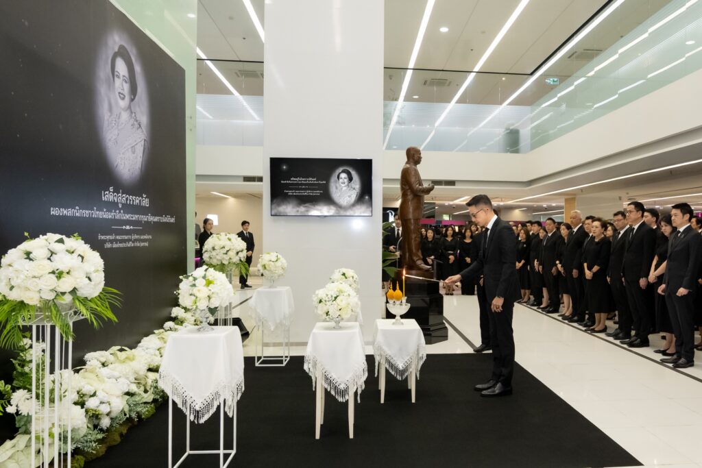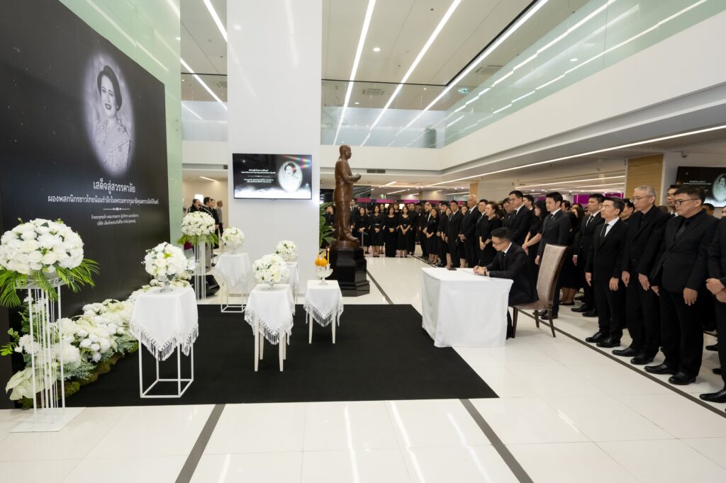 ในโอกาสนี้ นายสาระ ล่ำซำ ประธานเจ้าหน้าที่บริหาร ได้กล่าวถวายความอาลัย พร้อมกันนี้ คณะผู้บริหารและพนักงาน ได้พร้อมใจกันยืนสงบนิ่ง และลงนามในสมุดถวายความอาลัย เพื่อแสดงความจงรักภักดี และน้อมรำลึกถึงพระมหากรุณาธิคุณที่ทรงมีต่อพสกนิกรชาวไทย ตลอดระยะเวลาที่ทรงปฏิบัติพระราชกรณียกิจน้อยใหญ่นานัปการ ตามที่ทรงตั้งพระราชปณิธานอย่างแน่วแน่ ในการบำเพ็ญพระราชกรณียกิจมาตลอดพระชนม์ชีพ เพื่อบำบัดทุกข์บำรุงสุข แก่พสกนิกรชาวไทยในทุกหนแห่ง อีกทั้ง ยังทรงส่งเสริมงานด้านศิลปวัฒนธรรม หัตถศิลป์ไทย ตลอดจนการอนุรักษ์ธรรมชาติและสิ่งแวดล้อม รวมทั้งการพัฒนาคุณภาพชีวิตของประชาชนในถิ่นทุรกันดาร ซึ่งสะท้อนถึงพระเมตตาของสมเด็จพระนางเจ้าสิริกิติ์ พระบรมราชินีนาถ พระบรมราชชนนีพันปีหลวง สมดังพระราชสมัญญา “พระแม่ของแผ่นดิน”