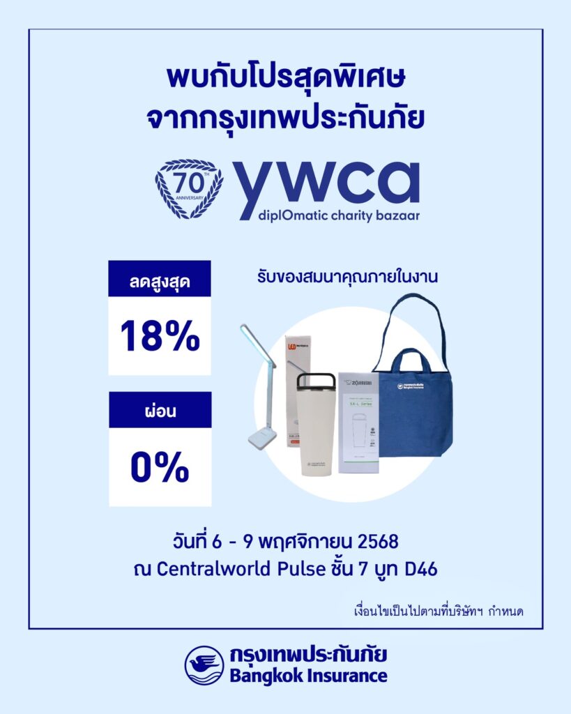 บริษัท กรุงเทพประกันภัย จำกัด (มหาชน) ขอเชิญร่วมงาน YWCA Diplomatic Charity Bazaar ครั้งที่ 70 งานชอปสินค้านานาชาติเพื่อการกุศลที่รวมกว่า 200 ร้านค้า และกว่า 40 สถานทูตจากทั่วโลก พบกับบูทกรุงเทพประกันภัย (บูท D46) ที่นำเสนอหลากหลายแผนประกันภัยให้เลือกตามความต้องการ พร้อมรับโปรโมชันสุดพิเศษ ได้ที่ CentralWorld Pulse ชั้น 7 ในวันที่ 6 – 9 พฤศจิกายน 2568