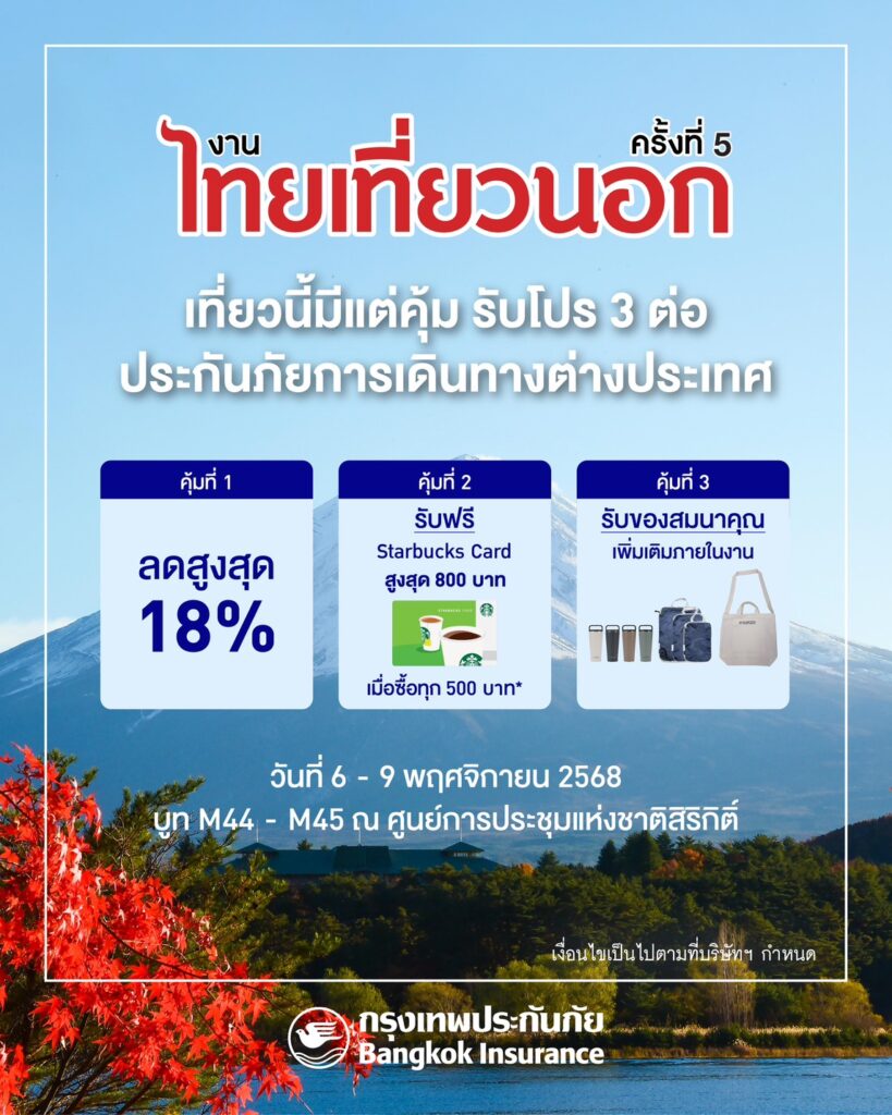 พิเศษสำหรับผู้รักการดำน้ำ บริษัทฯ นำเสนอแผนประกันภัยนักดำน้ำ — ประกันภัยเพื่อการท่องเที่ยวภายในประเทศที่ออกแบบสำหรับนักดำน้ำโดยเฉพาะ ซึ่งกรุงเทพประกันภัยเป็นรายแรกในประเทศไทยที่เสนอผลิตภัณฑ์นี้ เพื่อรองรับไลฟ์สไตล์ของผู้ที่ชื่นชอบการผจญภัยใต้ท้องทะเล โดยมีเจ้าหน้าที่ผู้เชี่ยวชาญให้คำปรึกษาด้านประกันภัยอย่างใกล้ชิด พบกับกรุงเทพประกันภัยได้ที่บูท M44 – M45 ณ ศูนย์การประชุมแห่งชาติสิริกิติ์ ฮอลล์ 5 – 6 ชั้น LG ในวันที่ 6 – 9 พฤศจิกายน 2568