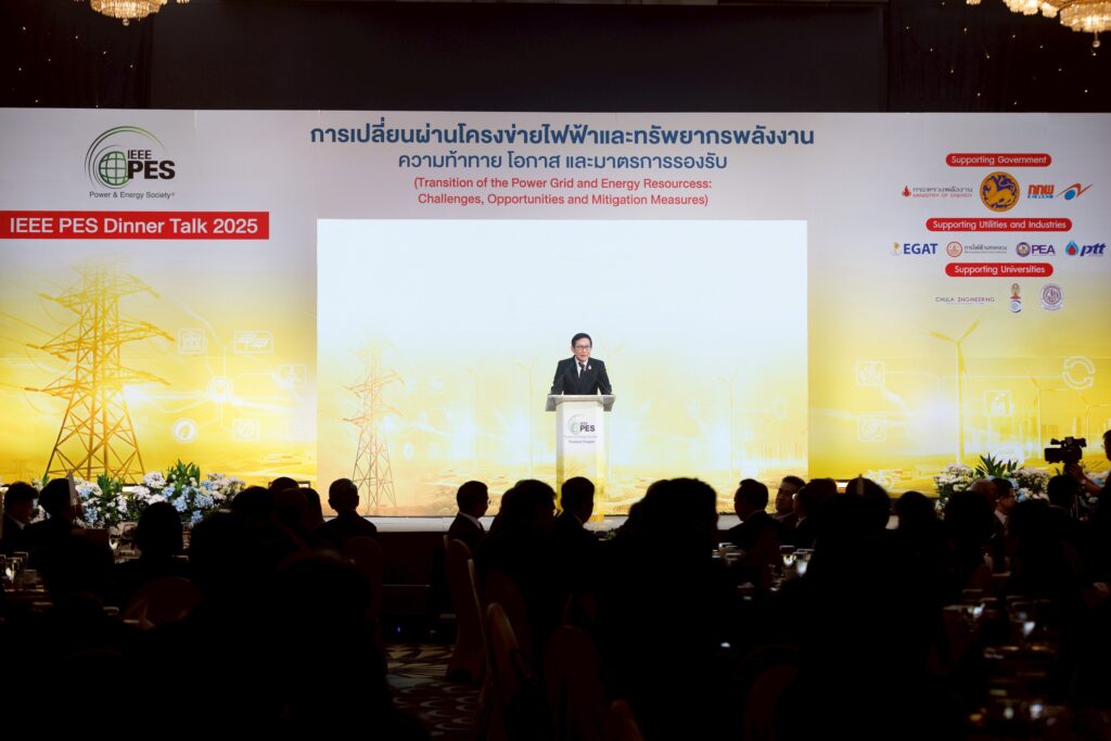 ด้าน นายนรินทร์ เผ่าวณิช ผู้ว่าการ กฟผ. ในนามนายกสมาคมไฟฟ้าและพลังงานไอทริปเปิลอี (ประเทศไทย) เปิดเผยว่า งาน IEEE PES Dinner Talk 2025 จัดขึ้นในหัวข้อ “การเปลี่ยนผ่านโครงข่ายไฟฟ้าและทรัพยากรพลังงาน : ความท้าทาย โอกาส และมาตรการรองรับ” เป็นเวทีสำคัญที่เปิดโอกาสให้ผู้นำและผู้เชี่ยวชาญด้านพลังงานได้ร่วมแลกเปลี่ยนวิสัยทัศน์ นโยบาย และเทคโนโลยีใหม่ ๆ นำไปสู่แนวทางในการต่อยอดระบบไฟฟ้าไทยให้เป็นธรรมและยั่งยืน รวมถึงการขับเคลื่อนการเปลี่ยนผ่านระบบพลังงานของประเทศอย่างเป็นรูปธรรม โดยภาครัฐ เอกชน และสถาบันการศึกษา จะเป็นพลังขับเคลื่อนสำคัญให้ประเทศไทยก้าวสู่ระบบพลังงานที่ยั่งยืนและแข่งขันได้ในระดับสากล